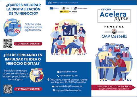La OAP Castelló ofrecerá también un autodiagnóstico digital gratuito, consistente en un análisis del estado de situación digital y de una propuesta o plan de actuación con recomendaciones específicas ajustadas a la realidad de cada negocio. Este servicio se completa con asesoramiento individualizado, prestado por el equipo técnico de FEMEVAL a través de atención telefónica, correo electrónico, videollamada o de forma presencial.
