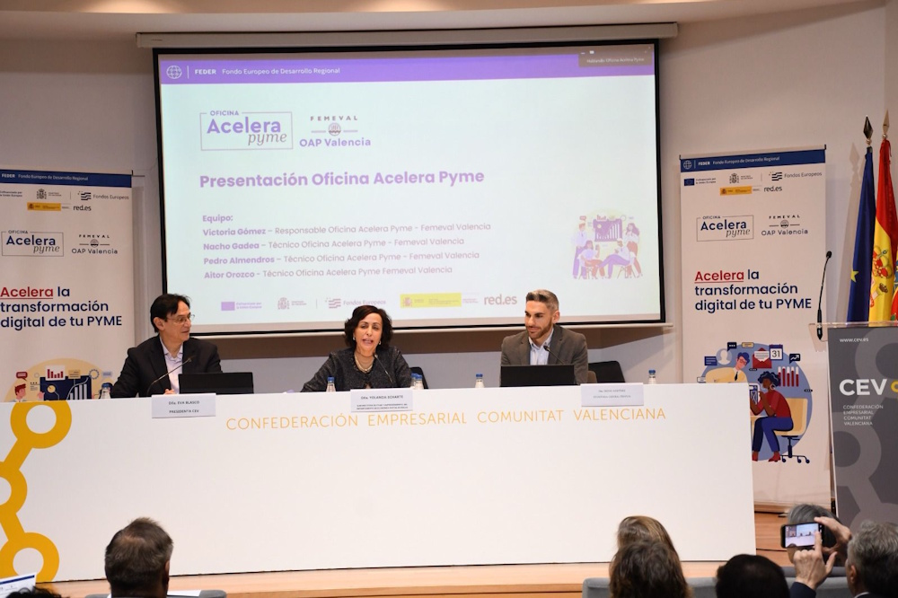 Yolanda Echarte, subdirectora de Pyme y Emprendimiento del departamento de Economía Digital en Red.es, Eva Blasco, presidenta de CEV Valencia, y Empar Martínez, secretaria general de FEMEVAL, han inaugurado el acto de presentación oficial de la Oficina Acelera Pyme Valencia de FEMEVAL (OAP Valencia FEMEVAL).